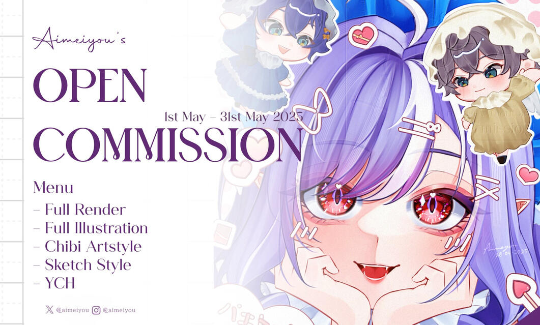Diperbolehkan untuk mengupload hasil komisi selama masih terdapat credit atas nama Aimeiyou (boleh menambah, namun TOLONG jangan menghapus watermark asli).